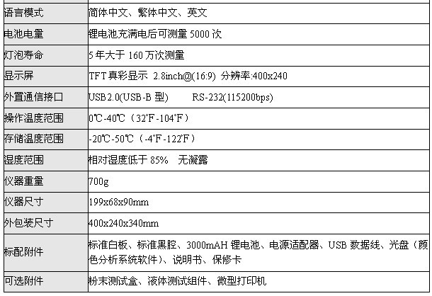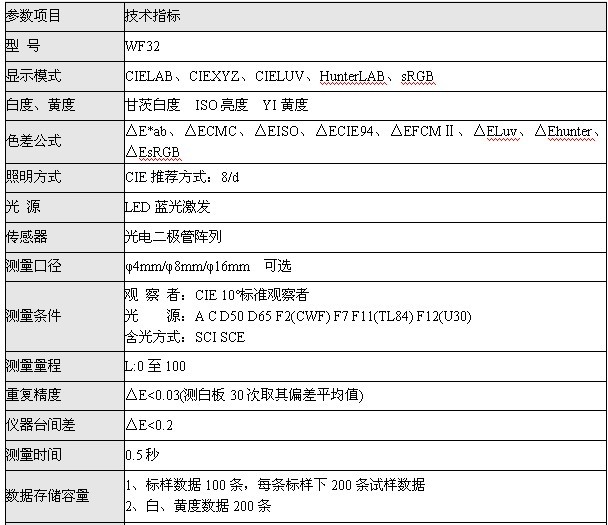 WF32色差儀是一款高精度、高穩(wěn)定性、多功能的色差儀。WF32擁有8種測量光源(A、D50、D65、C、F2、F7、F11和F12);六種顯色模式(CIE1976LAB、CIEXYZ、CIELUV、HunterLAB、sRGB、白黃度);八種色差公式(△E*ab、△ECMC、△EISO、△ECIE94、△EFCMⅡ、△ELuv、△Ehunter、△EsRGB);三種語言模式(簡體中文、繁體中文和英文);有三種測量口徑供用戶選擇。WF32色差儀還能進(jìn)行白黃度測量和平均測量,有大容量數(shù)據(jù)存儲空間,也可以外接微型打印機(jī)進(jìn)行測量數(shù)據(jù)的實(shí)時(shí)打印,并能與儀器標(biāo)配的《顏色分析系統(tǒng)》軟件配合使用。